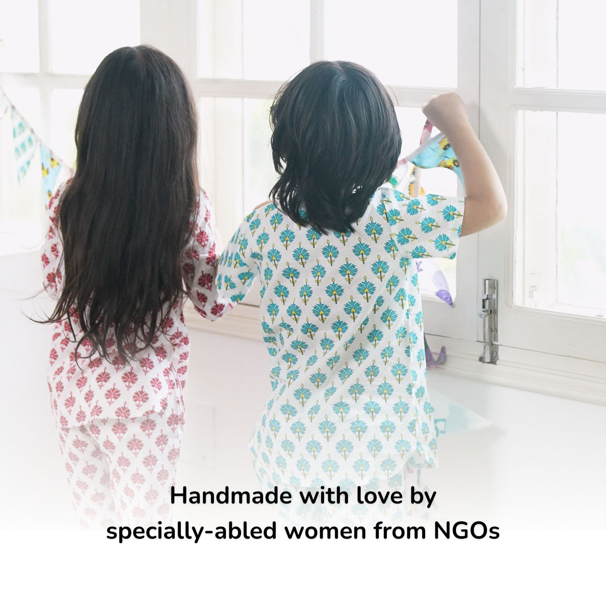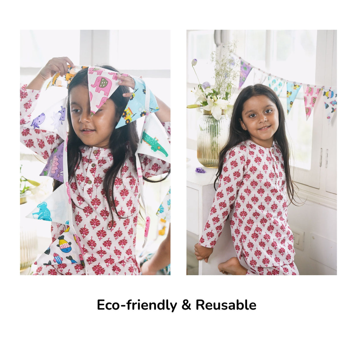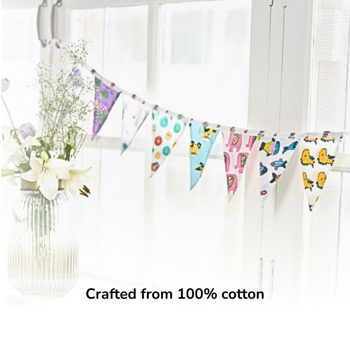 Each flag you hang spreads joy in your space, while lighting up the lives of those who made them. These buntings are crafted from 100% cotton, its eco-friendly, reusable, & machine wash .